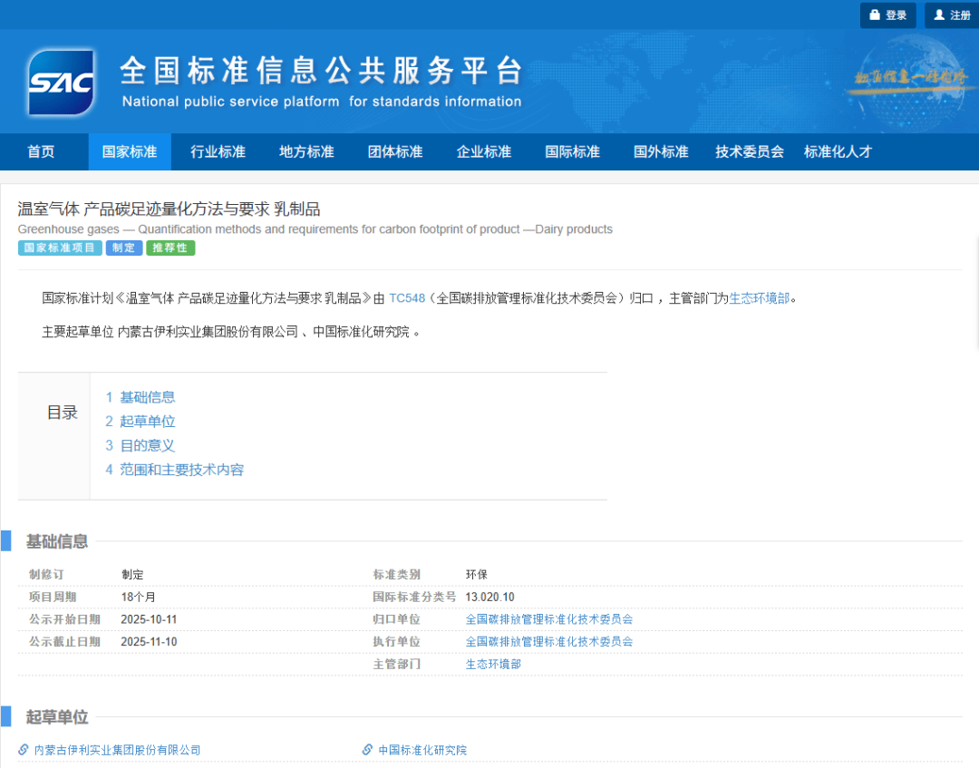 邦内首项乳成品碳脚印邦标立项公示! 伊利“邦标 + 平台 + 试点”三重发力引颈行业低碳圭表化